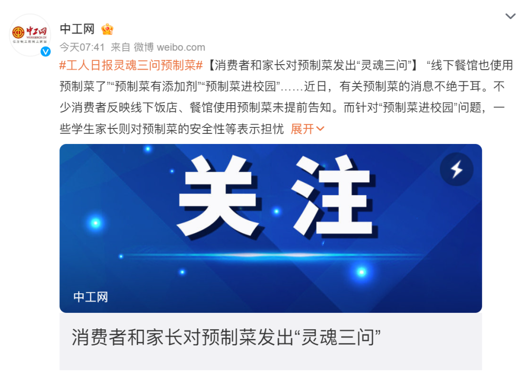 从“辨认预制菜”在各平台爆出话题,到“预制菜进校园”引发多地学生家长的声讨,消费者对于预制菜“进军”餐饮的现状表现出了极度的不满和排斥,对预制菜发出“灵魂三问”。